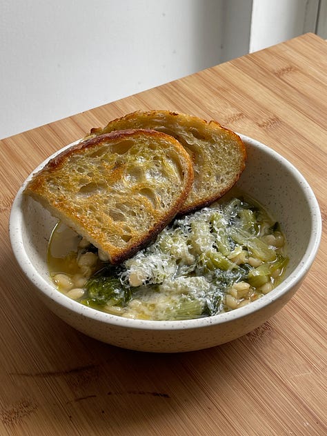 On cooking responsibilities:Definitely not structured. Oh God, it's time. I need to be thinking about dinner. What are we making? And we split the responsibility. And I would actually say that he probably cooks more than I do, which is a significant source of tension. I like things that are very flavorful, but that can be stewed or mixed together. I prefer cooked things, so I would say that—we focus on seasonality, but there are things that we can get all year, like the chickpeas and the lentils and whatever. And those are also good cold when it becomes nicer out. I think I'm a little bit more inventive when the summer comes and we can eat more raw things. And those things, those vegetables and fruits, are more interesting. But I definitely feel like I get into a rut in the winter. After I've made the chickpea and bean stew like eight times, what else is there exactly?